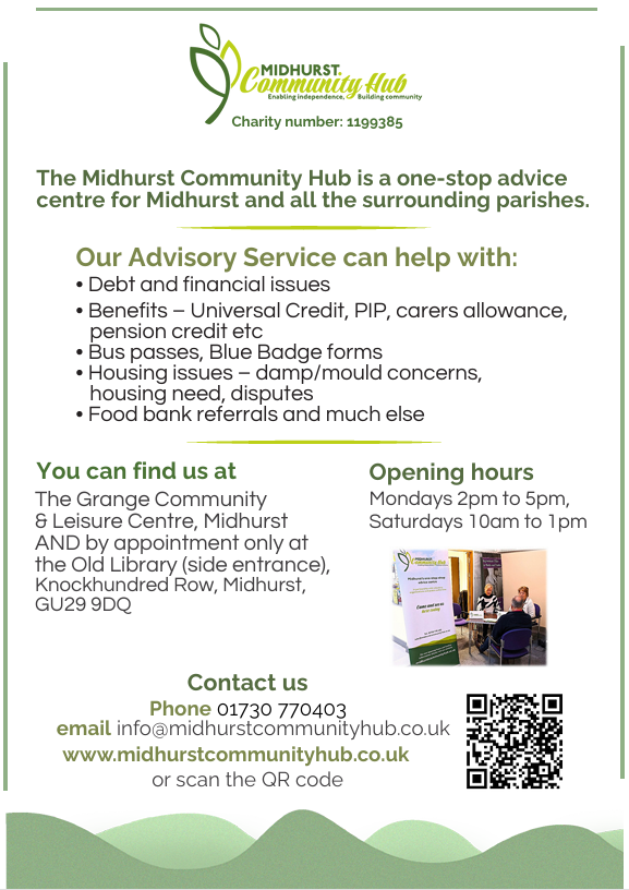 Chichester District Council has arranged two drop-in information sessions for residents and businesses in Midhurst. These will take place on Thursday 6 April (10am–12pm) and Wednesday 12 April (2pm–4pm) and will be held at the South Downs National Park Authority offices. Chichester District Council staff from the Supporting You, Economic Development and Social Prescribing services will be on hand to provide information and help.